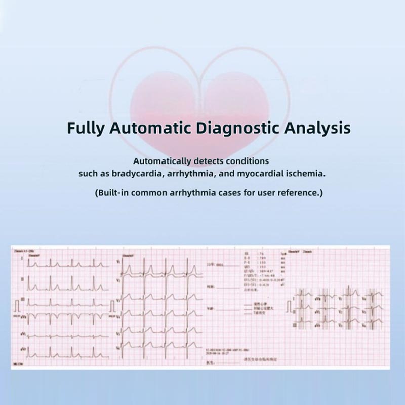 3. Vår HTSY® elektrokardiograf är utrustad med automatisk hjärtfrekvensmätning och intelligenta analysfunktioner, vilket gör den mycket lämplig för daglig klinisk diagnos. Den använder professionellt kliniskt testat elektrokardiogram analysalgoritmer, som exakt kan fånga de subtila förändringarna i hjärtats elektriska signaler, automatiskt identifiera olika onormala elektriska hjärtsignaler, snabbt ge exakta resultat för hjärtfrekvensmätningar och a fullständig preliminär analysrapport, vilket eliminerar behovet av medicinsk personal att manuellt beräkna och analysera vågformer. Dessutom innehåller maskinen olika typiska fall av vanliga kliniska arytmier, vilket underlättar medicinsk personal att komma åt och hänvisa till dem när som helst under diagnosen, vilket hjälper dem att göra mer exakta bedömningar om patientens tillstånd.