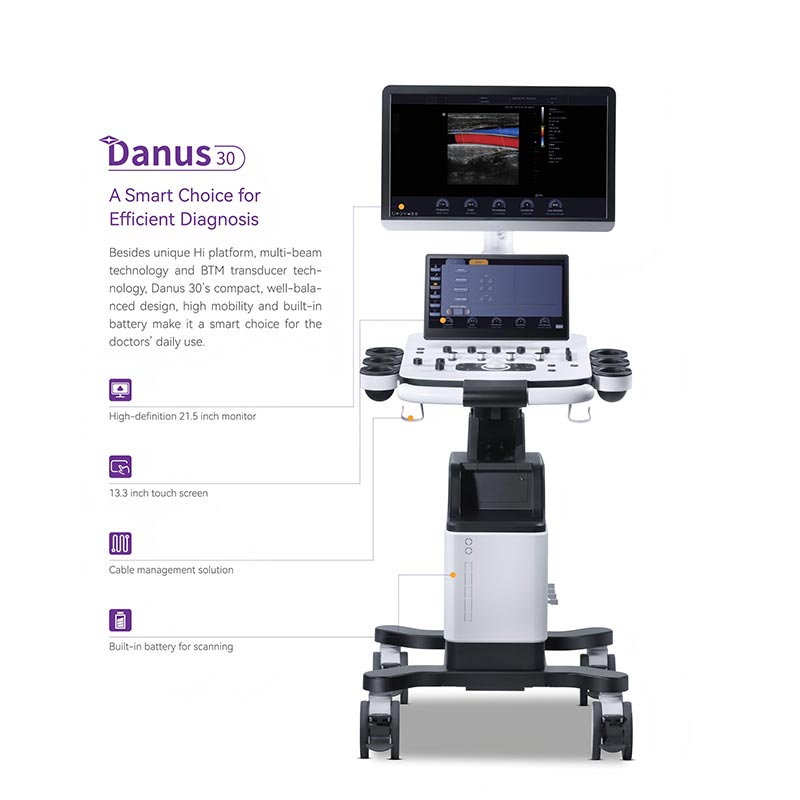 Ultraljudsmaskin är ett smart val för effektiv diagnos. Förutom unik Hi-plattform, multi-beam-teknik och BTM-transduktorteknologi, Danus 30:s kompakta, välbalanserade design, höga mobilitet och inbyggda batterifabrikat det är ett smart val för läkarnas dagliga användning.
